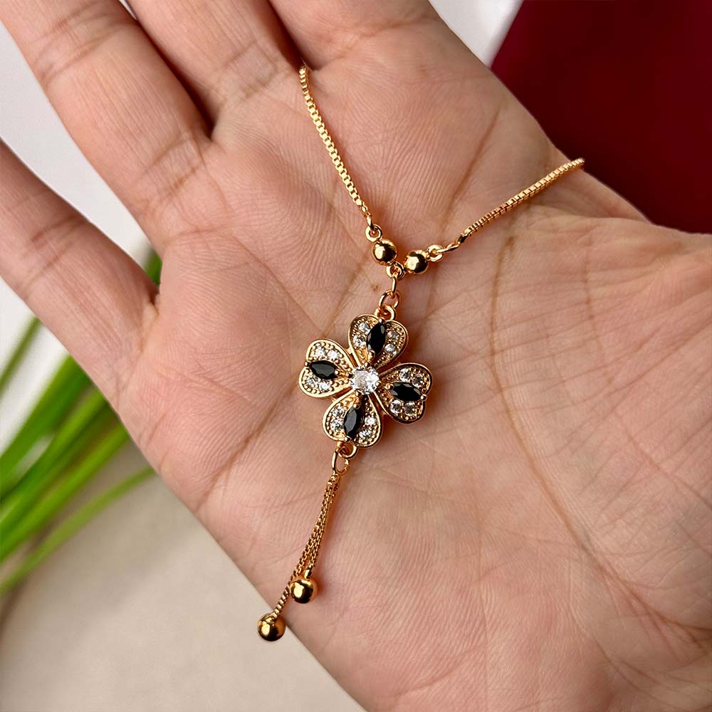 Alloy based pendant set enhanced with rose gold plating and micropaved stones with black sharmock design.